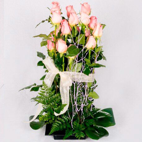 Elegante centro compuesto por 24 rosas rosas ornamentado con diferentes verdes y presentado en base de cerámica decorativa.