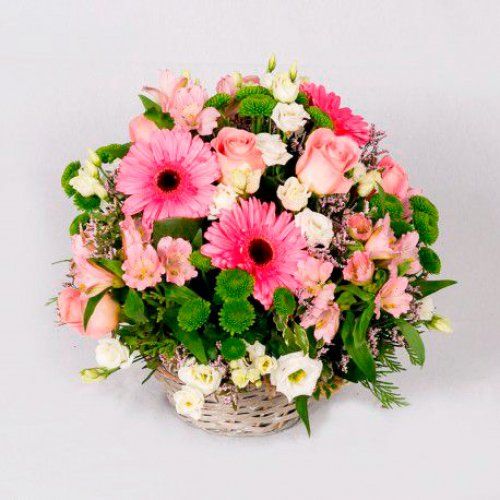 Composición en tonos suaves con gran variedad de material vegetal, como eucalipto o esparragueras.