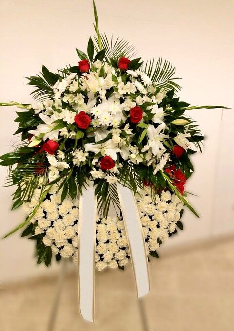 Composición elaborada en un aro lleno de claveles, menos en la parte de arriba, que estaría compuesta por un cabecero grande de flor variada acompañada de una cinta de condolencias.