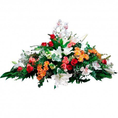 Palma grande de flor variada en diferentes tonalidades, acompañada de una cinta de condolencias.