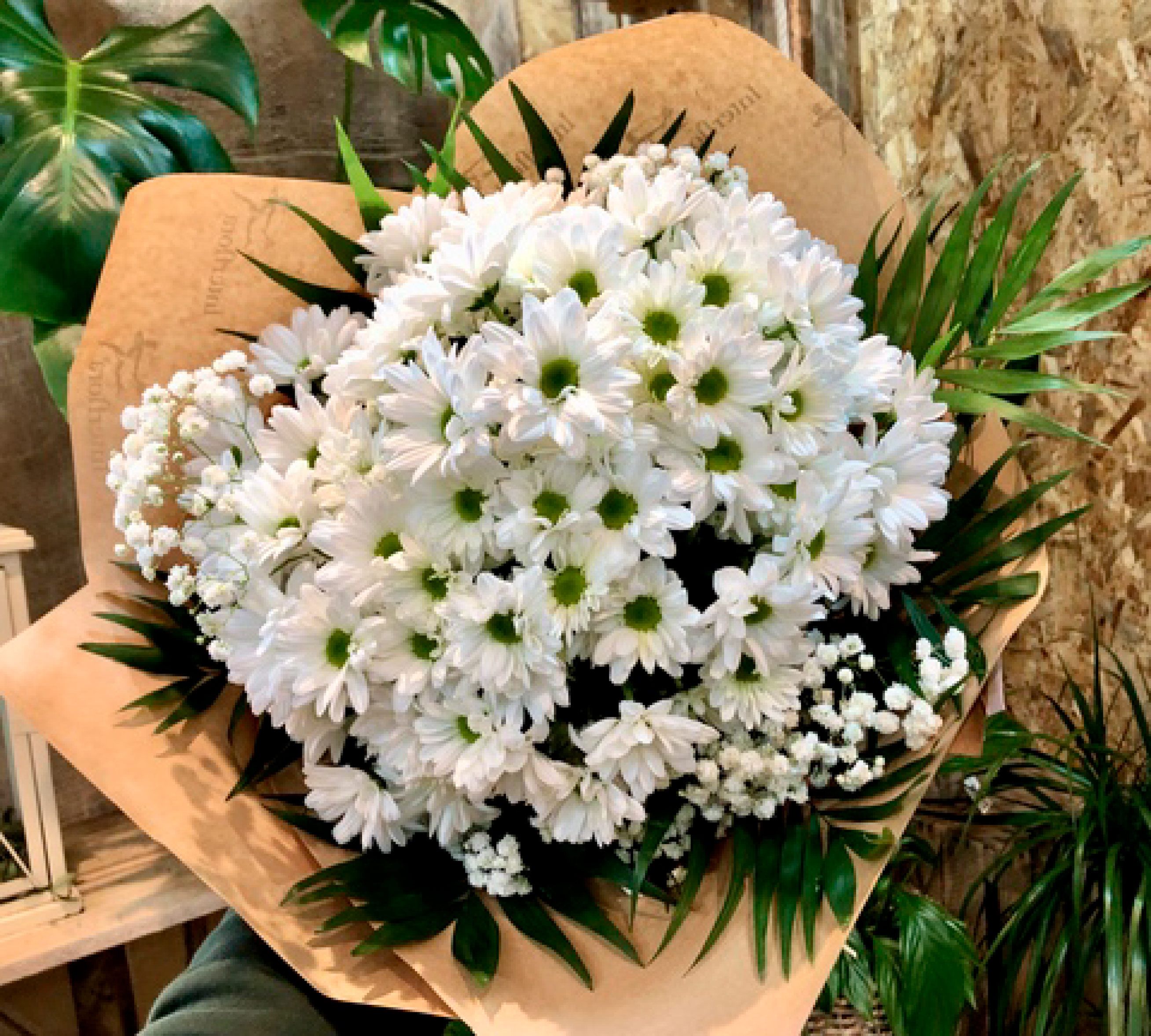 Ramo que destaca la sencillez y la belleza de las margaritas. Está compuesto por margaritas blancas, paniculata y verdes variados.