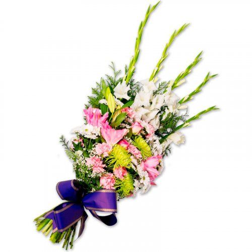 Ramo a una cara de flor variada en diferentes tonalidades, acompañado de una cinta de condolencias.