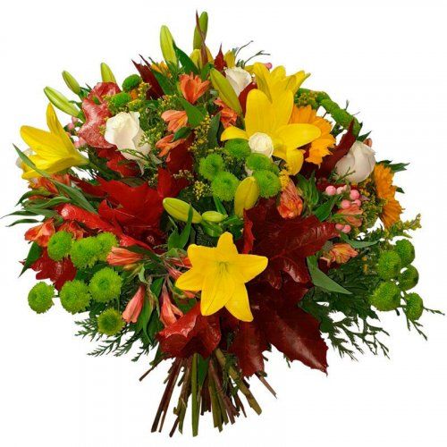 Ramo variado en tonos cálidos (naranja, rojo, amarillo…). Expresa los sentimientos más fuertes con este ramo lleno de color.