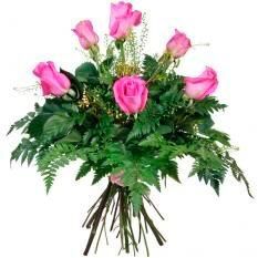 Ramo compuesto por 6 rosas de tallo largo de 70 cm, acompañadas de verdes variados y otra flor complementada con el color que nos indiques en las observaciones.